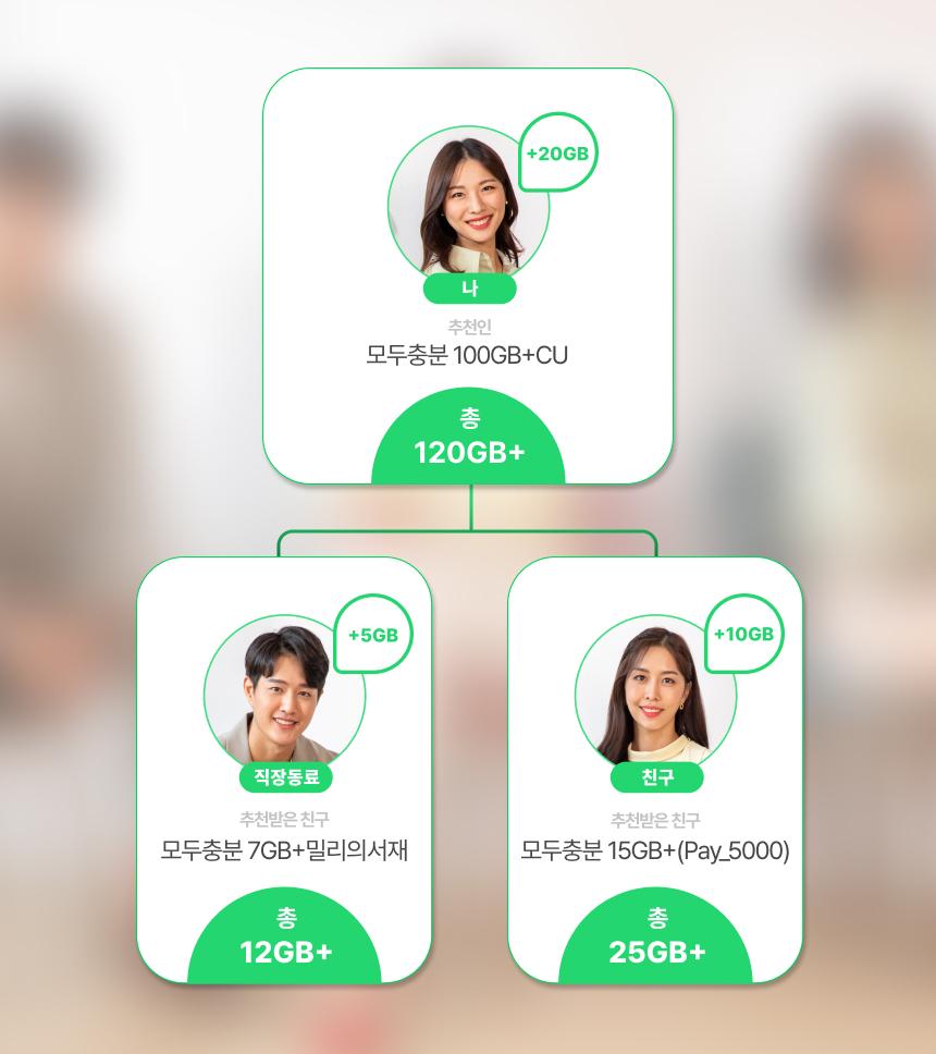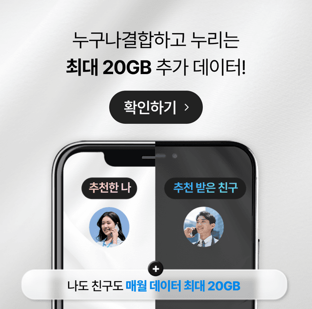 추천받은 친구 가입 월의 다음 달 말일에 쿠폰이 지급되며, 데이터는 개통 즉시 제공됩니다.매월 데이터 최대 20GB 추가 제공